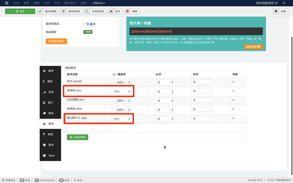 Step 03:點選「J2Store Cart」分頁回到商品編輯畫面,點選「選項」分頁將預先建立的選項群加進來。本範例中「處理器」與「獨立顯示卡」會因為款式選擇有變動,因此這兩個選項群的「上一層選項」要選擇「款式」以建立相依性。