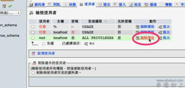 Step 03:在畫面中點選「主機」欄位為「locahost」的使用者「root」右方的「編輯權限」項目。